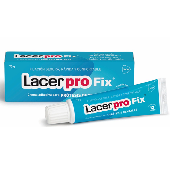 Lacerpro Fix es una crema adhesiva que proporciona una fijación rápida y segura de las dentaduras postizas, incluso cuando están perfectamente ajustadas. Su formulación permite una fijación segura durante más de 12 horas*. Una vez aplicada la crema y colocada la dentadura, esta reacciona con la saliva creando un cojín entre la prótesis y las encías, previniendo así la aparición de irritaciones en las encías. Lacerpro Fix permite ser utilizado con cualquier tipo de comida y bebida, evitando la introducción de partículas de alimentos entre la dentadura y las encías.